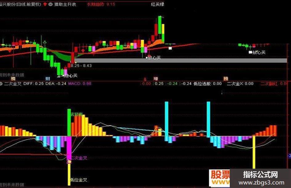 1、对MACD公式进行整合提取,自己做的副图公式,有兴趣的可以改成选股公式。 2、会根据上涨下跌的力度,提示顶背离和底背离,以及底部金叉和二次金叉,DIf下拐DEA但未交叉,且未跌破零轴时,提示翻红。 3、自己做了一些修改,信号比MACD要更灵敏一些。 4、同时出现二次金叉和底背离时,上涨的概率极高。