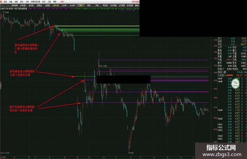 枚红色水平画线表示阳量 绿色水平画线表示阴量,黄色加粗水平画线表示阴量最高画线。根据画线可以参考N周期阳量 阴量集中在哪个价位,参考买进 卖出