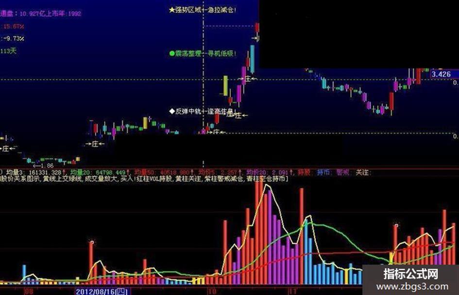 DRAWTEXTABS(40,0,'[成交量和股价关系图示,黄线上交绿线,成交量放大,买入!红柱VOL持股,黄柱关注,紫柱警戒减仓,青柱空仓持币] '),LINETHICK1,colorYELLOW;