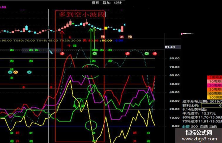 2.指标元素及信号的含义:①主力持仓线(红色线):可理解为庄家主力底仓,表示主力介入股票的程度,超过50进入多方行情,提示信号“多”,高于80进入走牛行情,提示信号“牛”,跌落80提示“减”,庄家主力减仓;跌破50提示“空”,庄家出货进入后期,进入空方行情。②累积资金流出与累积资金流入:累积资金相当于股票蓄水池总水量,衡量他对股价的推动作用要结合累积资金流入与累积资金流出此消彼长的变化关系。累积资金流入线(粉紫线)上穿累积资金流出线(绿色线),水涨船高,股价大概率上涨,用34号图标提示;累积资金流出线上穿累积资金流入线,股票蓄水池水位下降,股价大概率下跌,用35号图标提示。 ③净流入资金线(黄色线),可理解为主力拉抬股价资金,是最为活跃的因素,上蹿下跳,掀起股价小升小跌。