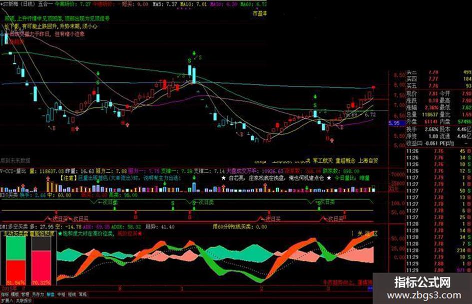 指标说明: 一、中间柱形信号买卖:准确不漂移。 出现“B、S”提示可操作! 二、上下三角信号买卖: 该买卖信号有点漂移,但不能认为不好,当左侧信号出现时可认为是买卖的预警信号,当三角信号右侧闭合完整时买卖、也就是在第二天买入或卖出! 三、换手率>16%时会有图标。 四、指标中有用法注释。