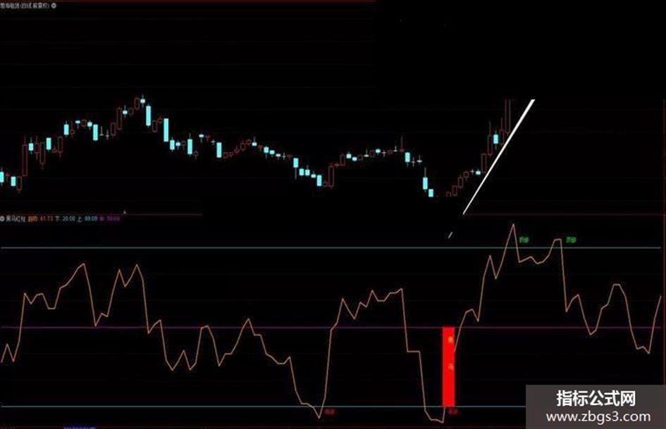 2、指标中的黑马红柱和底部均为我们的买点信号,当出现该信号时,此时就是我们的介入时机。