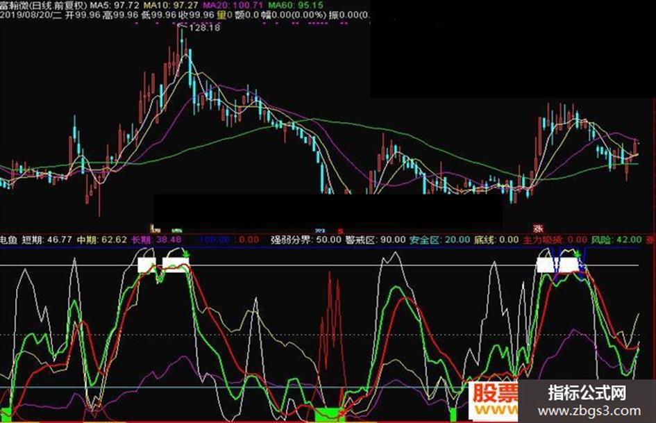 IF(FILTER(中期<REF(中期,1)AND 中期>90 AND BB<REF(BB,1),5),80,100),COLORBLUE,LINETHICK2;