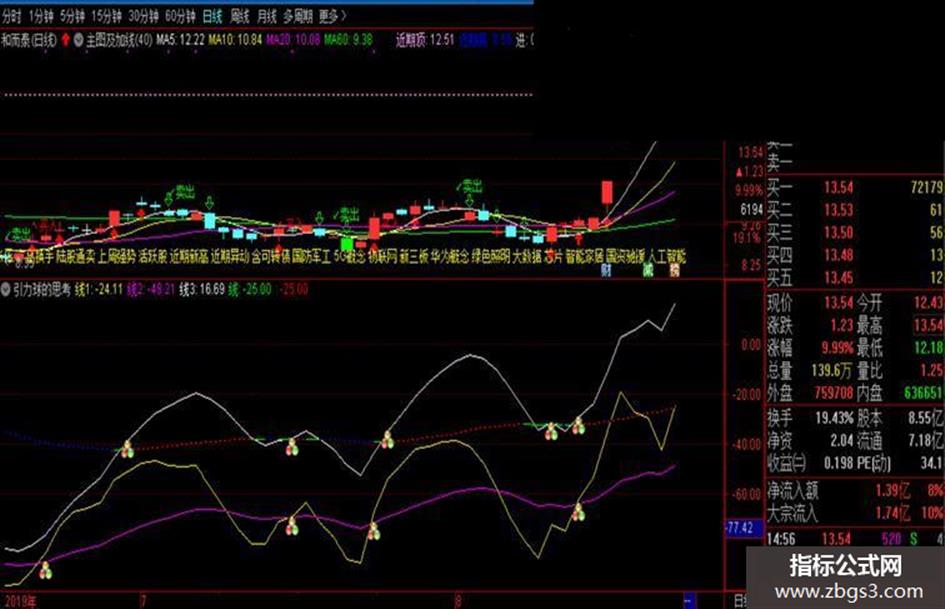 系统自带公式的应用延伸,增加了三色球买入提示。其它各种颜色的线的使用含义请自己总结并应用。注意:线1、线2、线3成组向上时应用效果比较好,分享的目的:指标不是万能的,思路很重要。