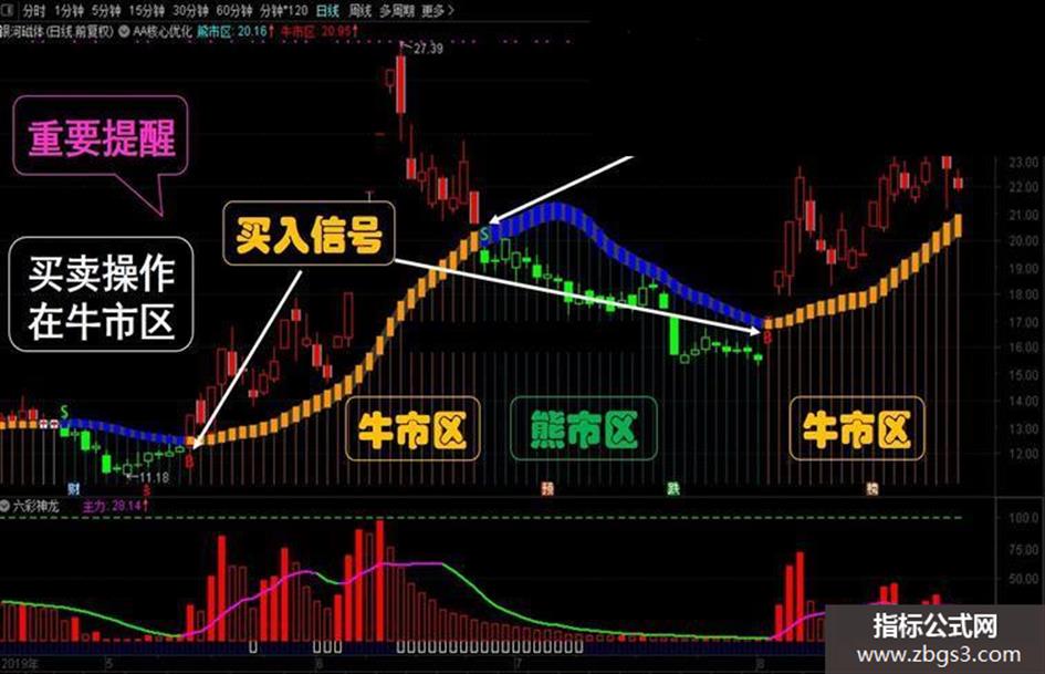 STICKLINE(C<牛市区 AND C<熊市区 AND C>O,C,H,0,1),COLORGREEN;