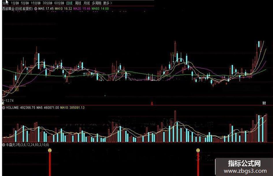 牛1:=IF(CROSS(0.9,1/VOL*1000>0.01 AND "KDJ.J"<0),1,0),COLORYELLOW,LINETHICK2;