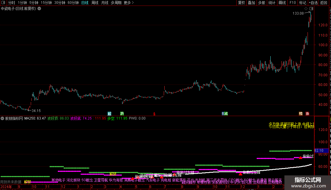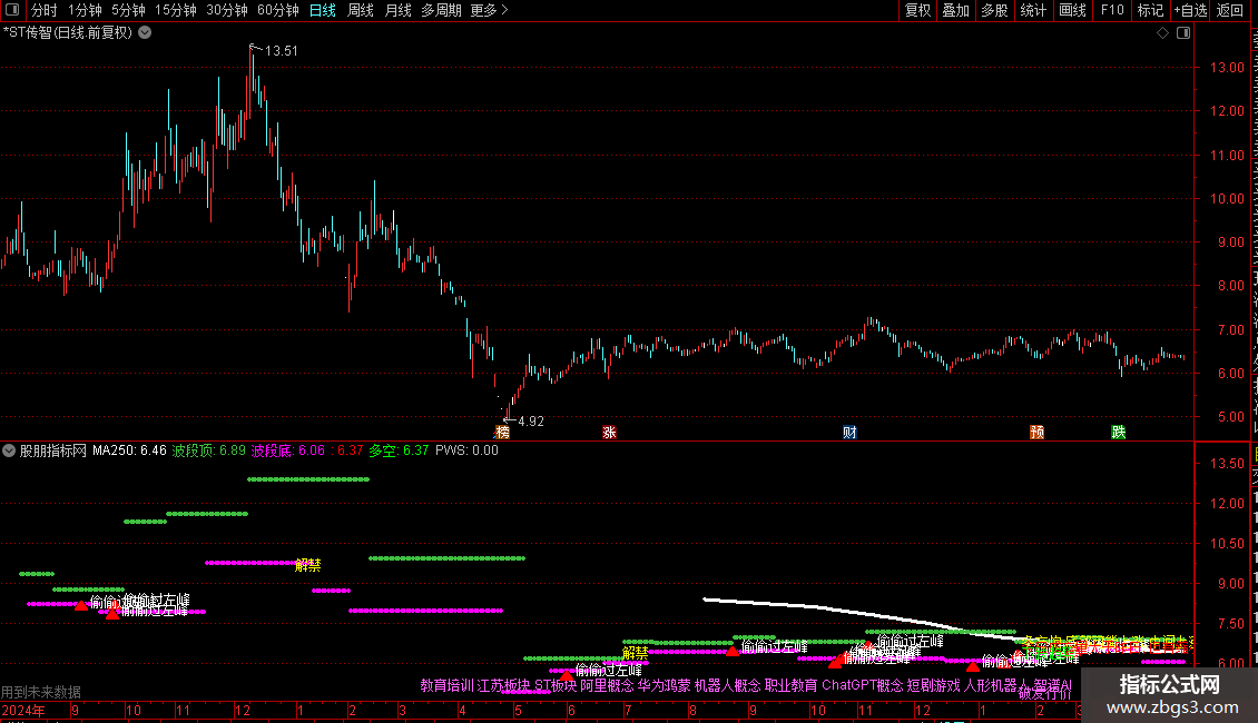 个股的行业版块和概念版块直接写主图上,便于一眼就看到,,能帮助避开一些雷,比如避开高质押,预亏损,业绩预降,近期解禁等,都有提示
