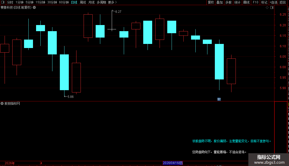 DRAWTEXT_FIX(情况7=1 ,右,上1,0,'该股放量下跌,走势明显偏弱,离场观望。'),COLORFFFFFF;