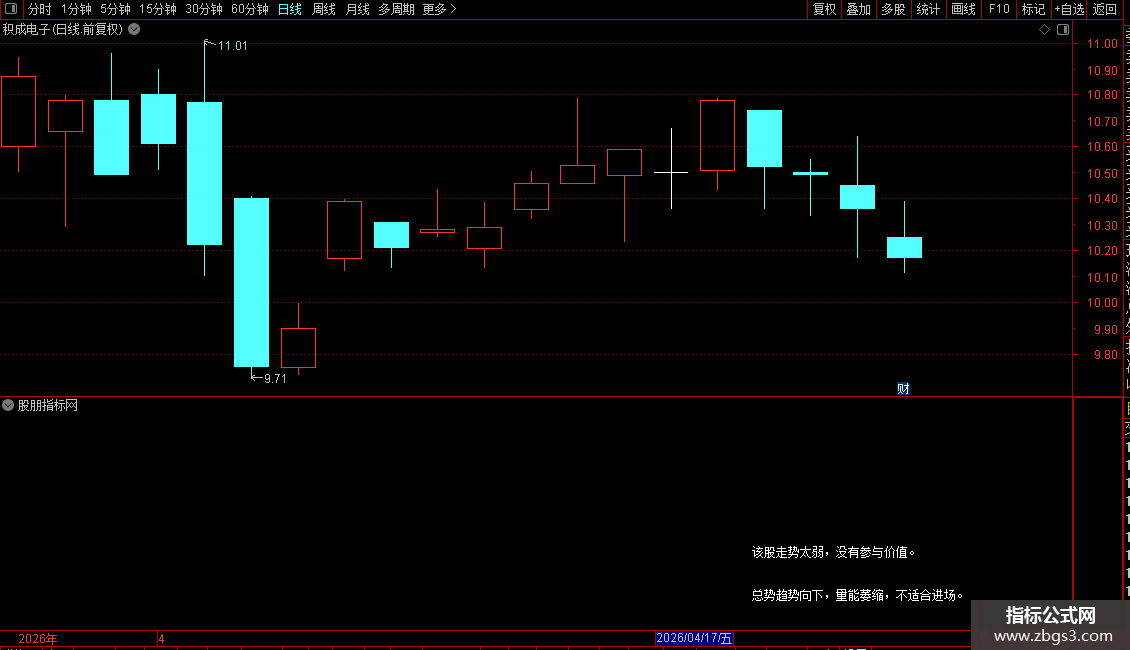 DRAWTEXT_FIX(情况16=1,右,上1,0,'该股走势太弱,没有参与价值。'),COLORFFFFFF;
