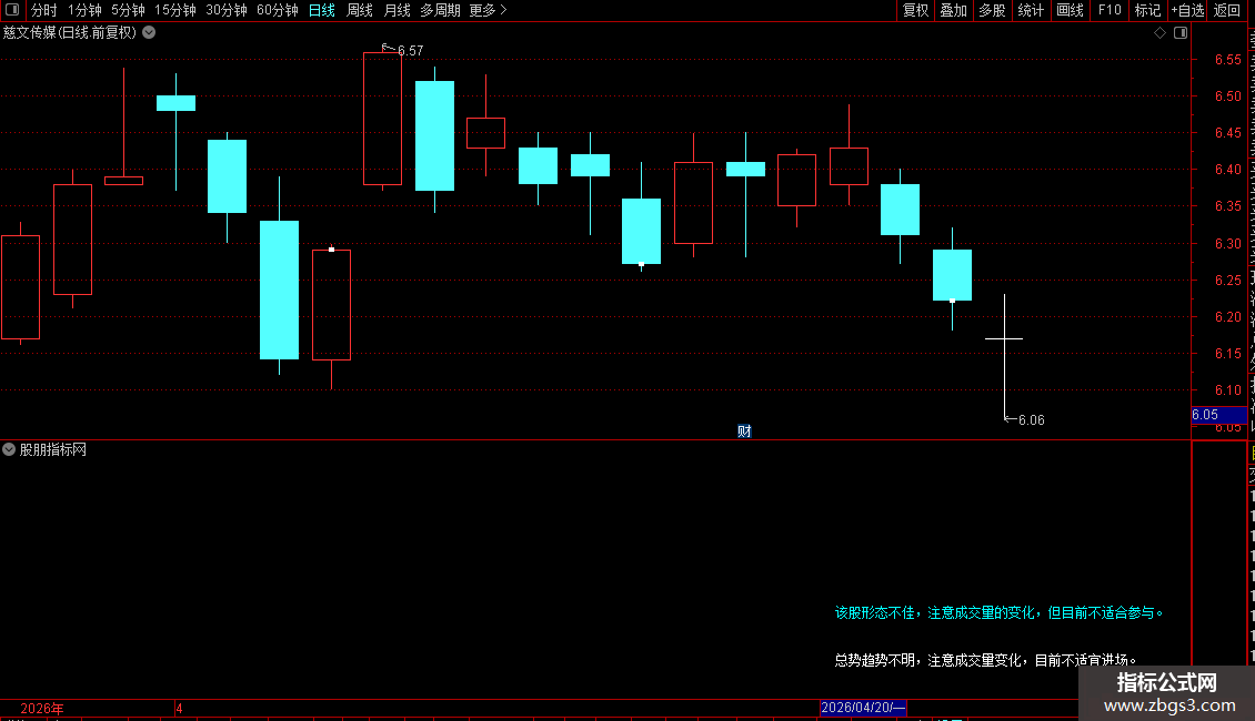 DRAWTEXT_FIX(情况13=1,右,上1,0,'该股形态不佳,注意成交量的变化,但目前不适合参与。'),COLORFFFF00;