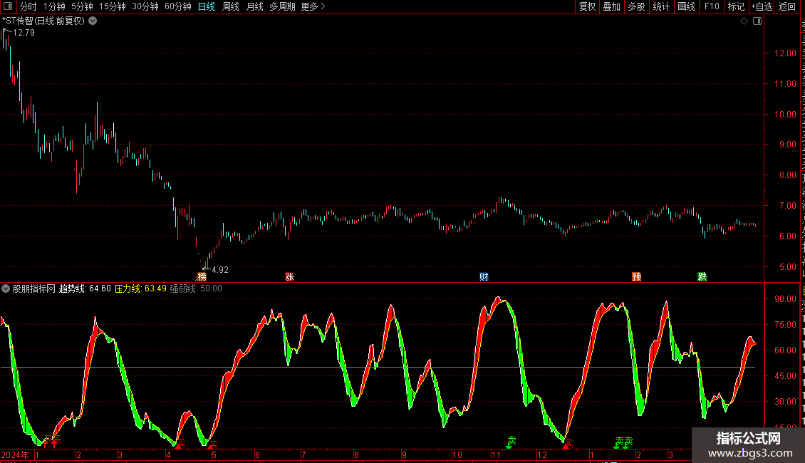 DRAWTEXT(CROSS(VAR3,VAR2) AND VAR2>80,HIGH*1.05,'卖'),COLORGREEN;