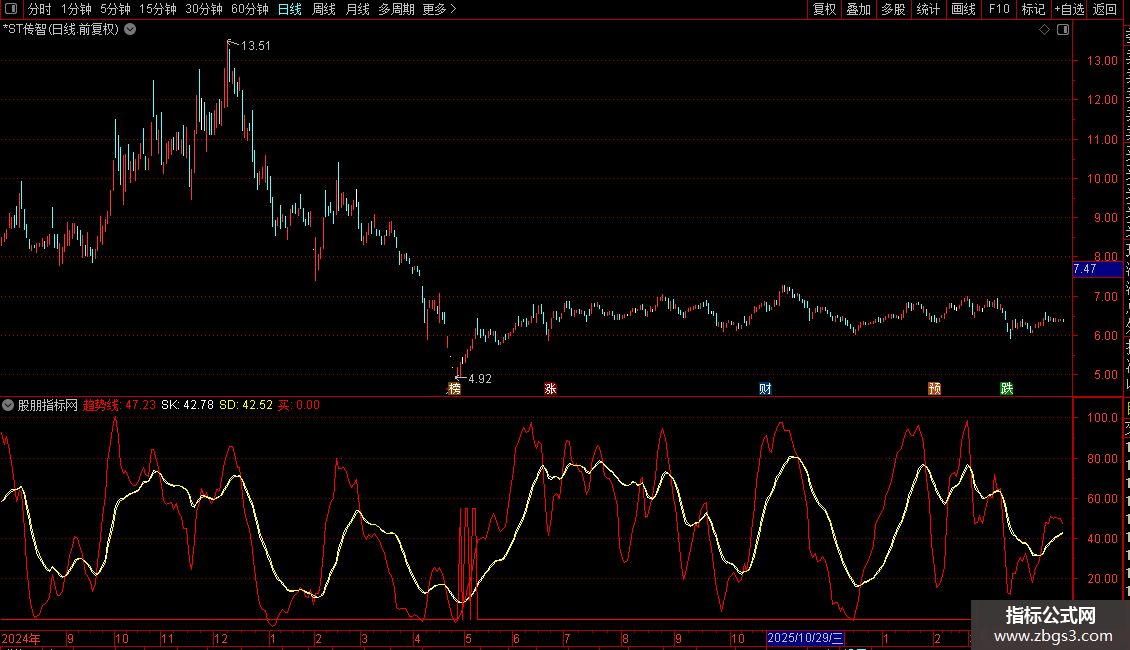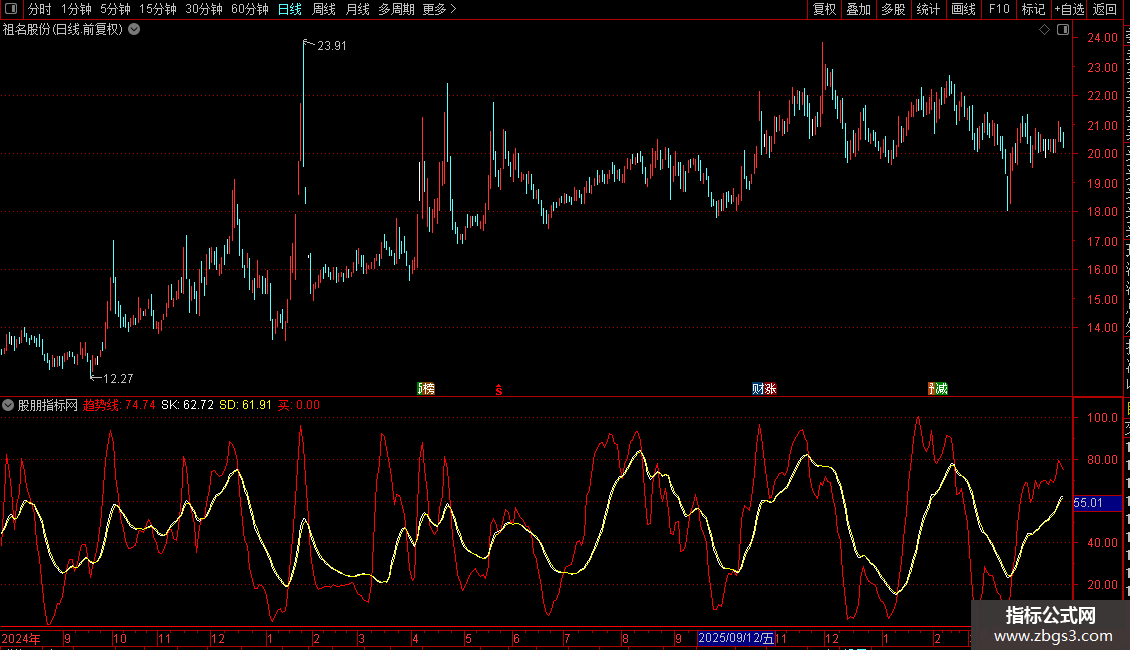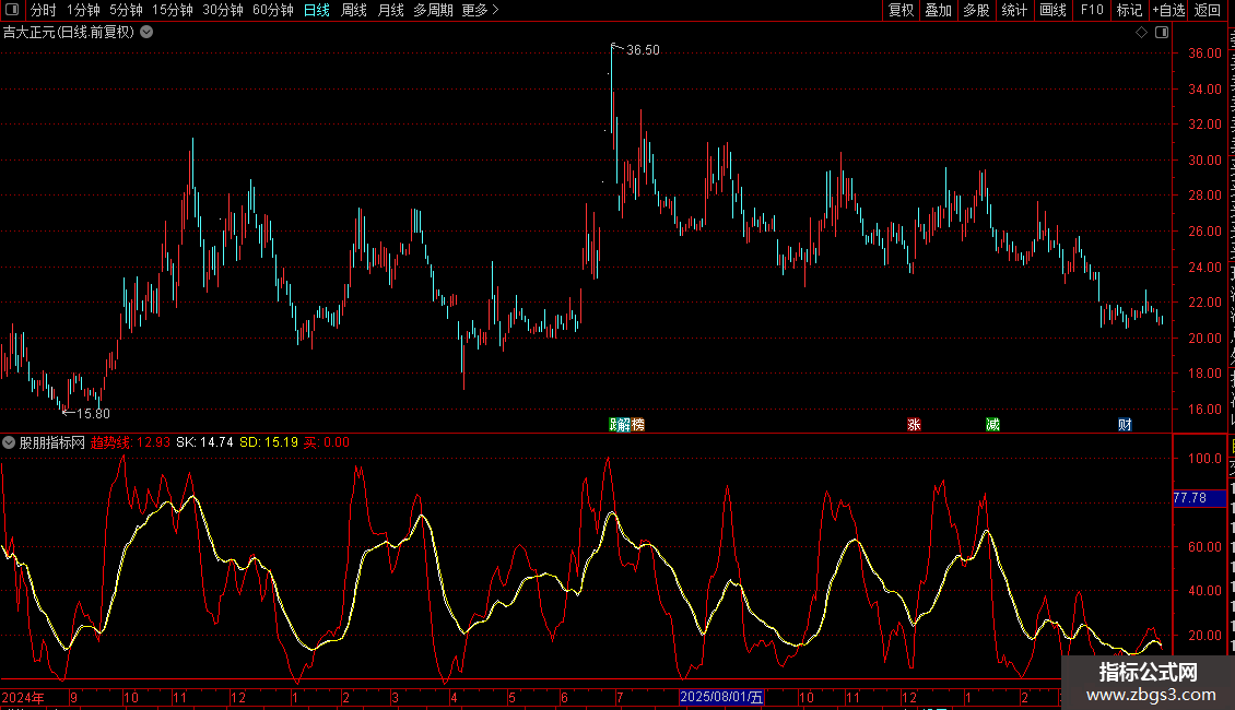 趋势线: ((3*SMA((CLOSE-LLV(LOW,27))/(HHV(HIGH,27)-LLV(LOW,27))*100,5,1)-2*SMA(SMA((CLOSE-LLV(LOW,27))/(HHV(HIGH,27)-LLV(LOW,27))*100,5,1),3,1)-50)*1.032+50),COLORRED;