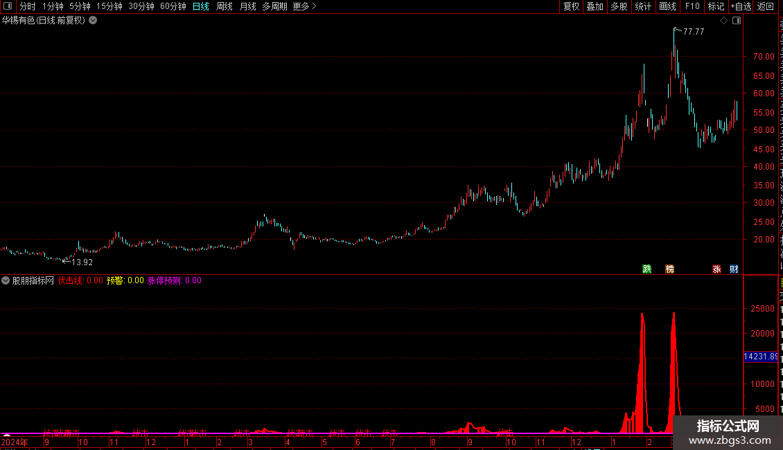 STICKLINE(伏击线>0 AND 伏击线>REF(伏击线,1),0,伏击线,2,0), COLORRED;
