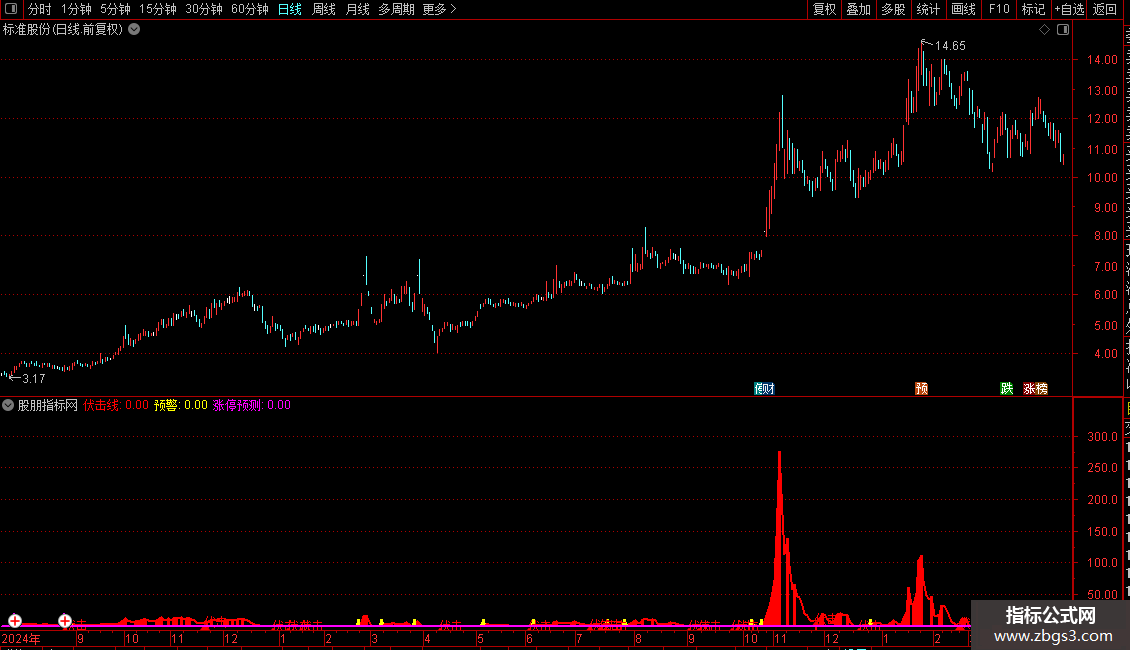 伏击线: IF(VAR3>0.1,VAR4,0)*5, COLORRED, LINETHICK2;