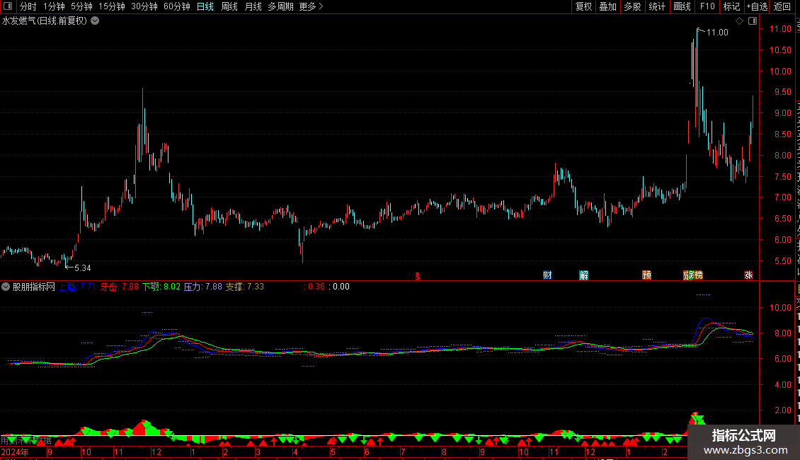 上唇:REF(SMA(VAR11,5,1),3),COLORBLUE;