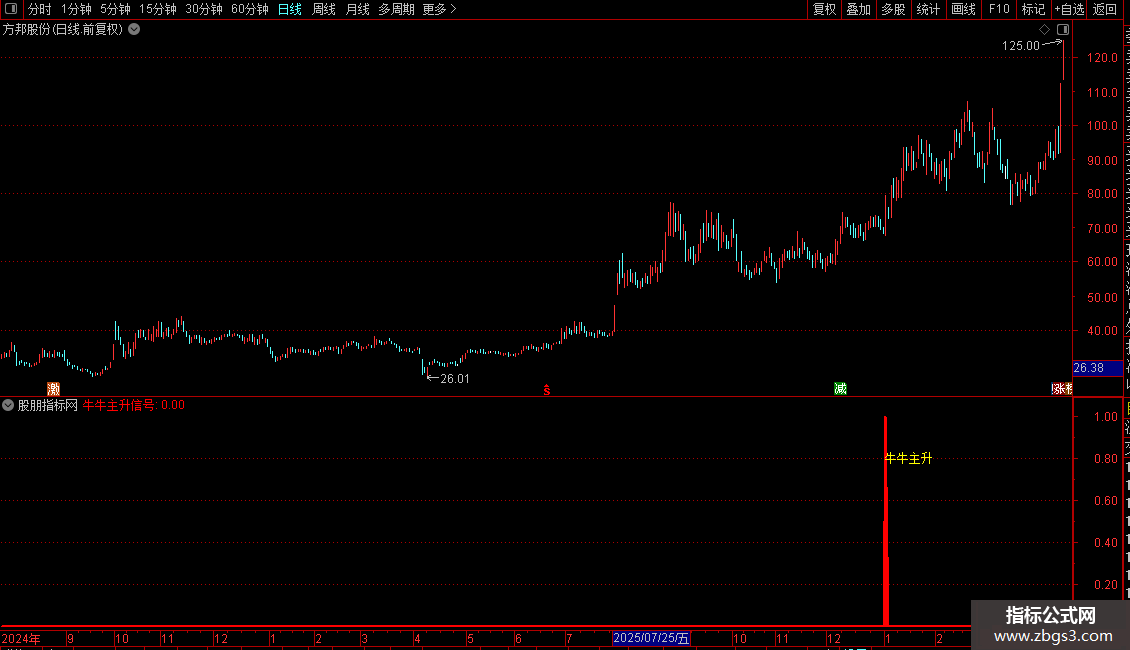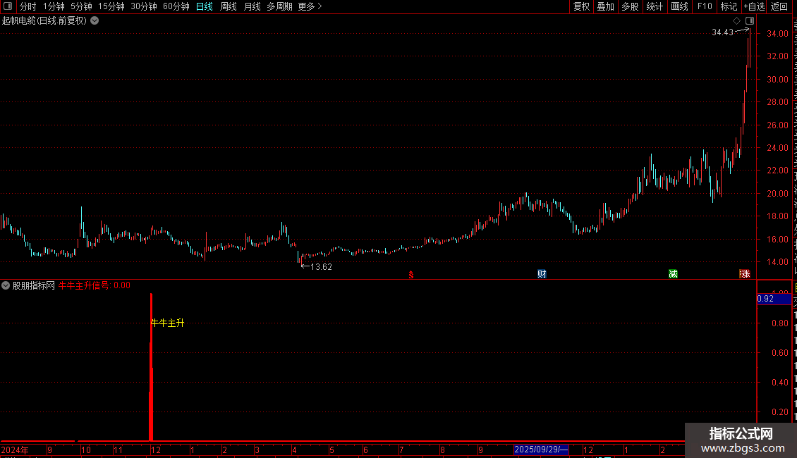 STICKLINE(牛牛主升信号,0,0.6,2,0),COLORRED;