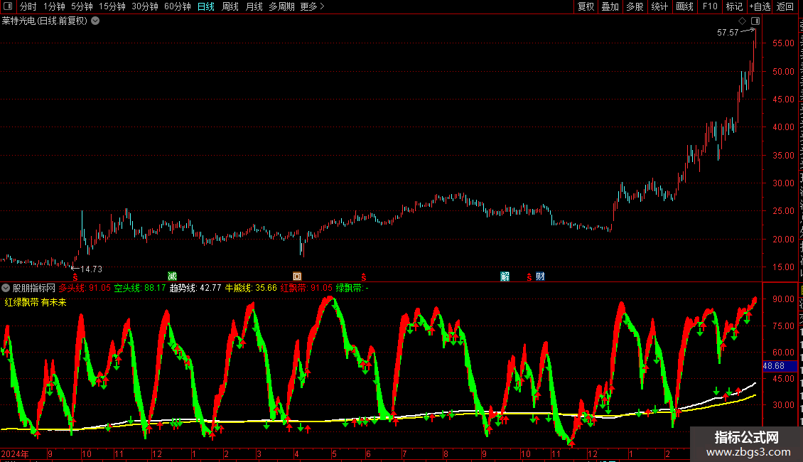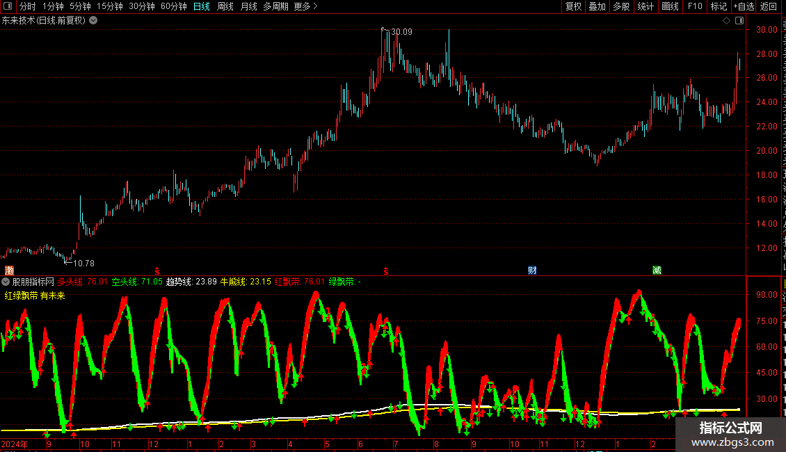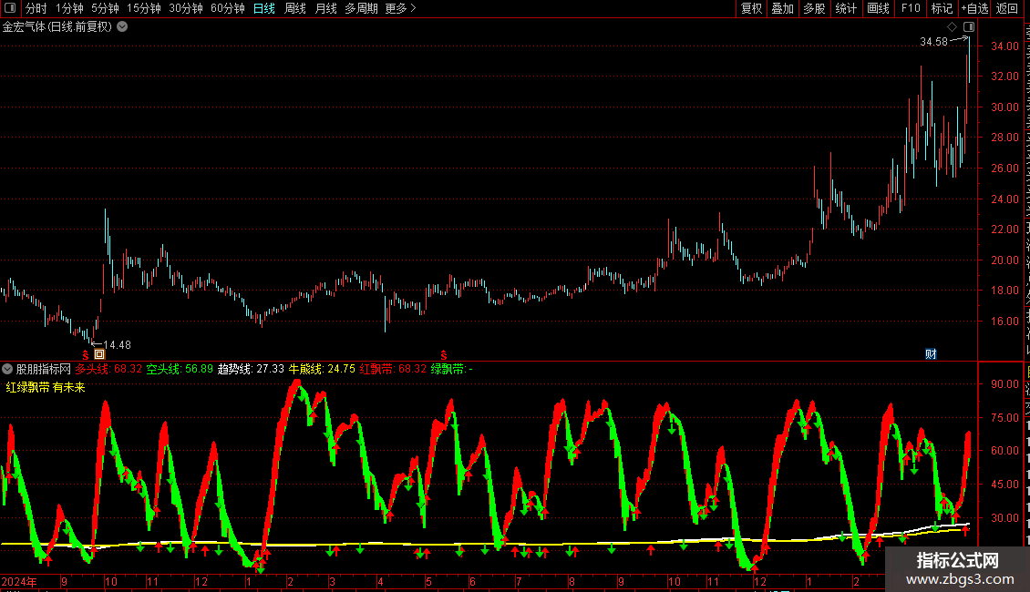指标里面的红绿飘带有未来函数,虽然有未来,但是也是很好用的。