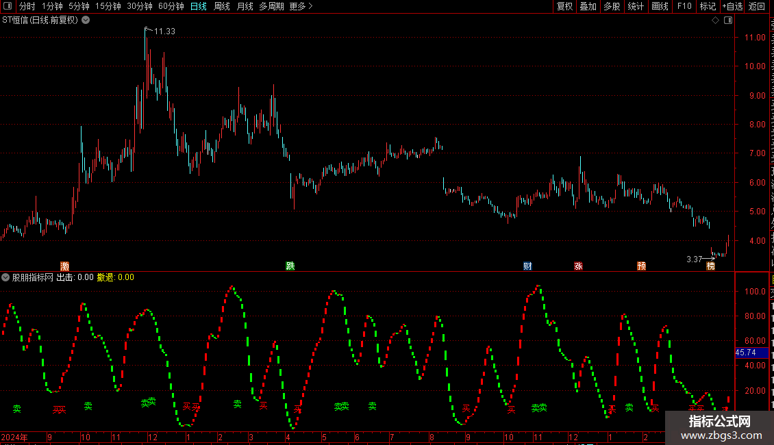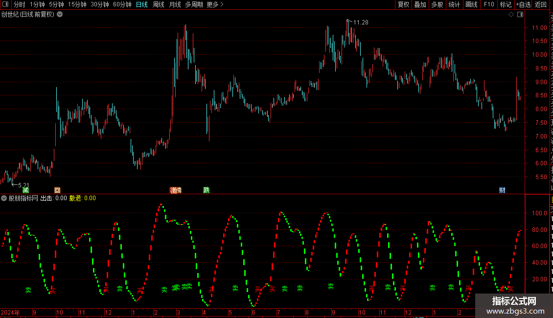 DRAWTEXT(CROSS(买线,卖线) AND 买线<20,LOW*0.98,'买'),COLORRED;