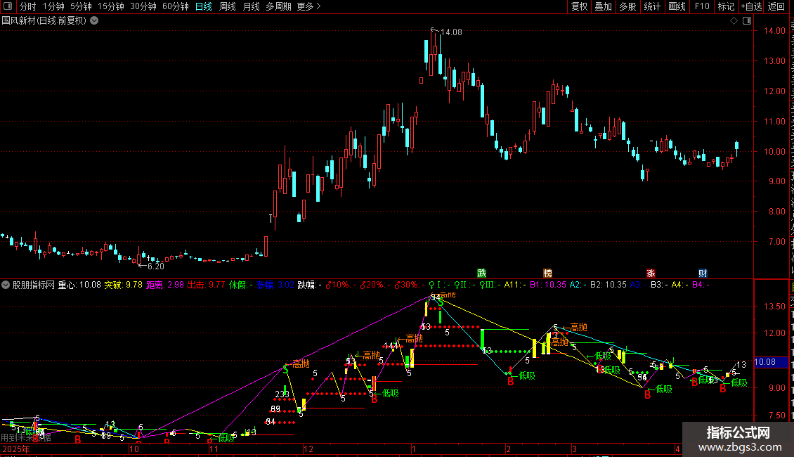 输出B2:当满足条件最低价<=13日内最低价的最低值时,在最低价位置画直线起点,当满足条件最高价>=13日内最高价的最高值时,在最高价位置画直线终点,0表示是否延长.