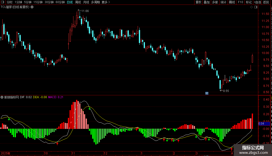 STICKLINE(MACD<0 AND MACD>=REF(MACD,1),0,MACD,2,0),COLORLIGREEN;