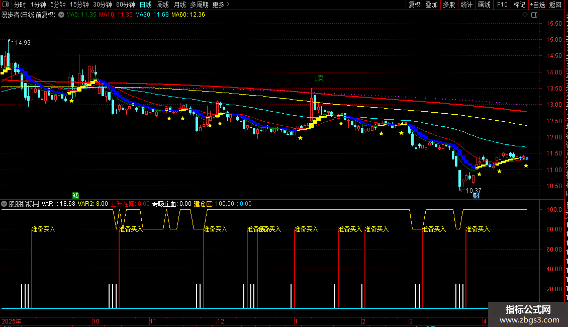 上升在即: IF(CROSS(VAR1,VAR2),80,0),STICK,COLOR0000CC,LINETHICK2;