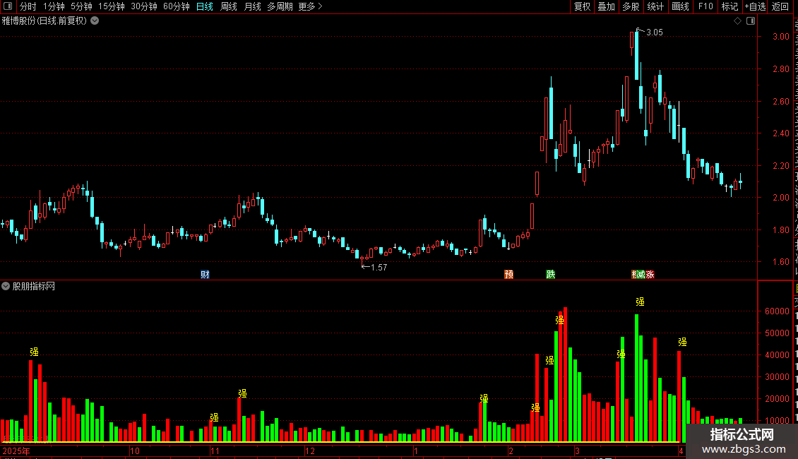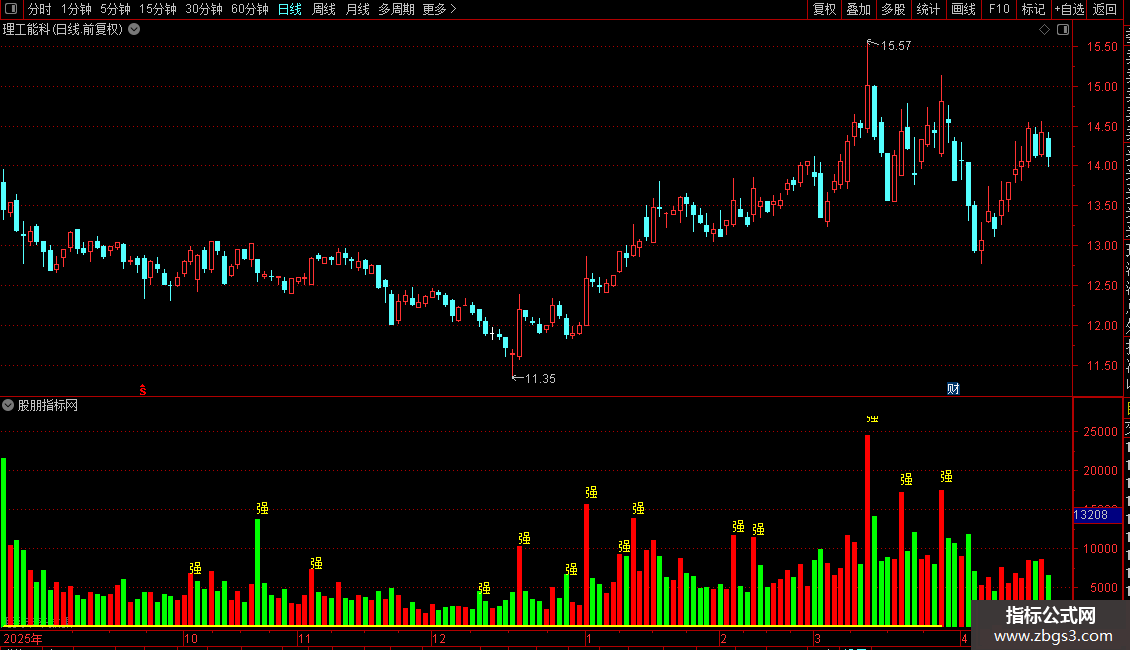 DRAWTEXT(CROSS(量能比,150),VOL*1.1,'强'),COLORYELLOW;