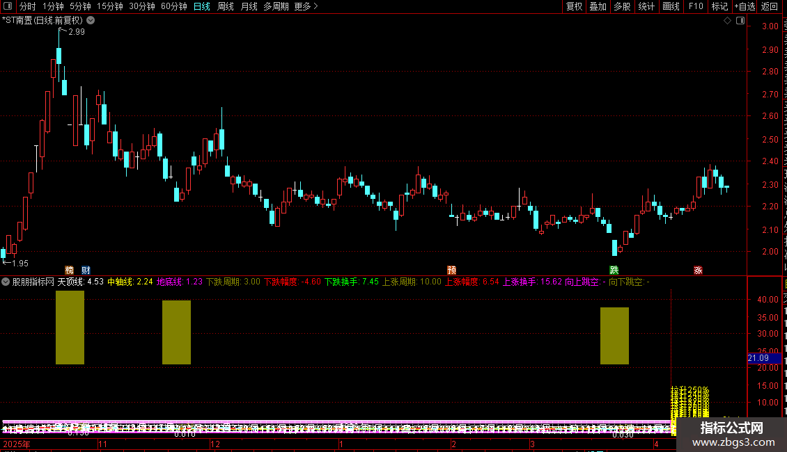 当满足条件日不等于1日前的日时,在最低价-0.2位置书写文字,画白色