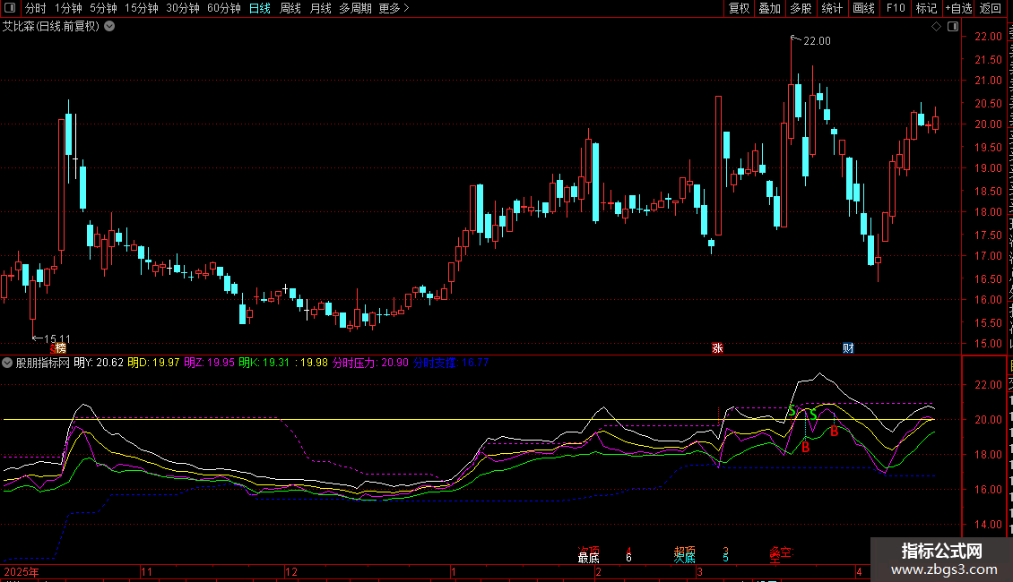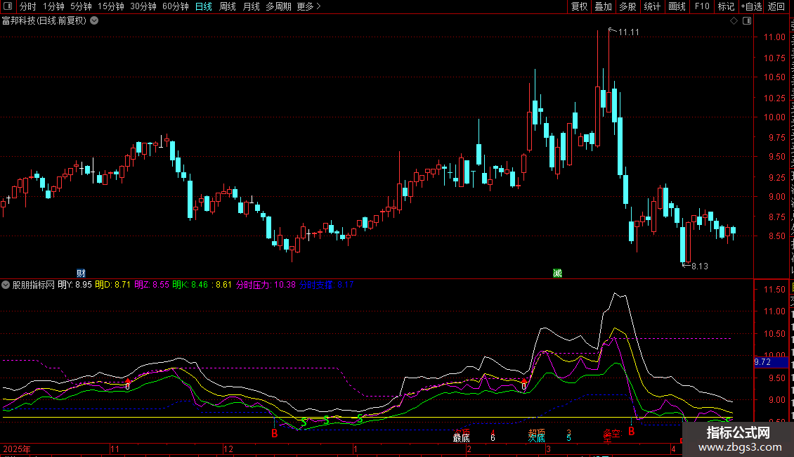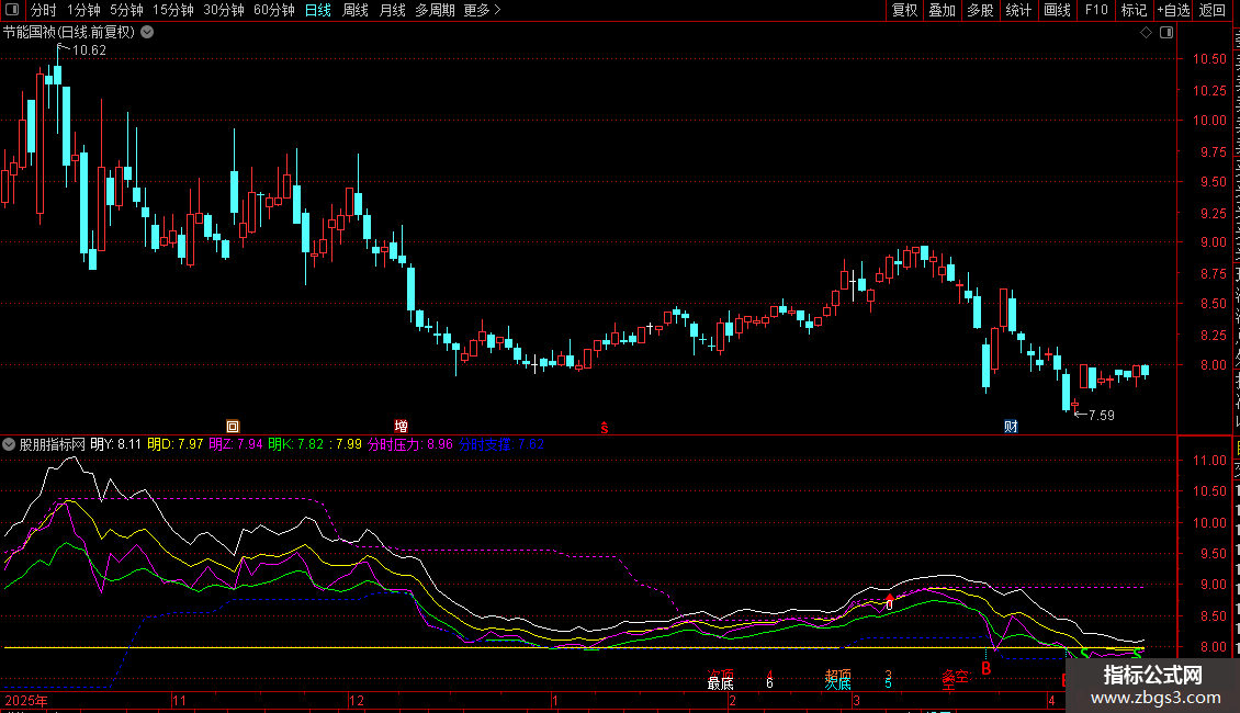 分时支撑:MA(REF(LLV(C,30),1),2),COLORBLUE,DOTLINE;