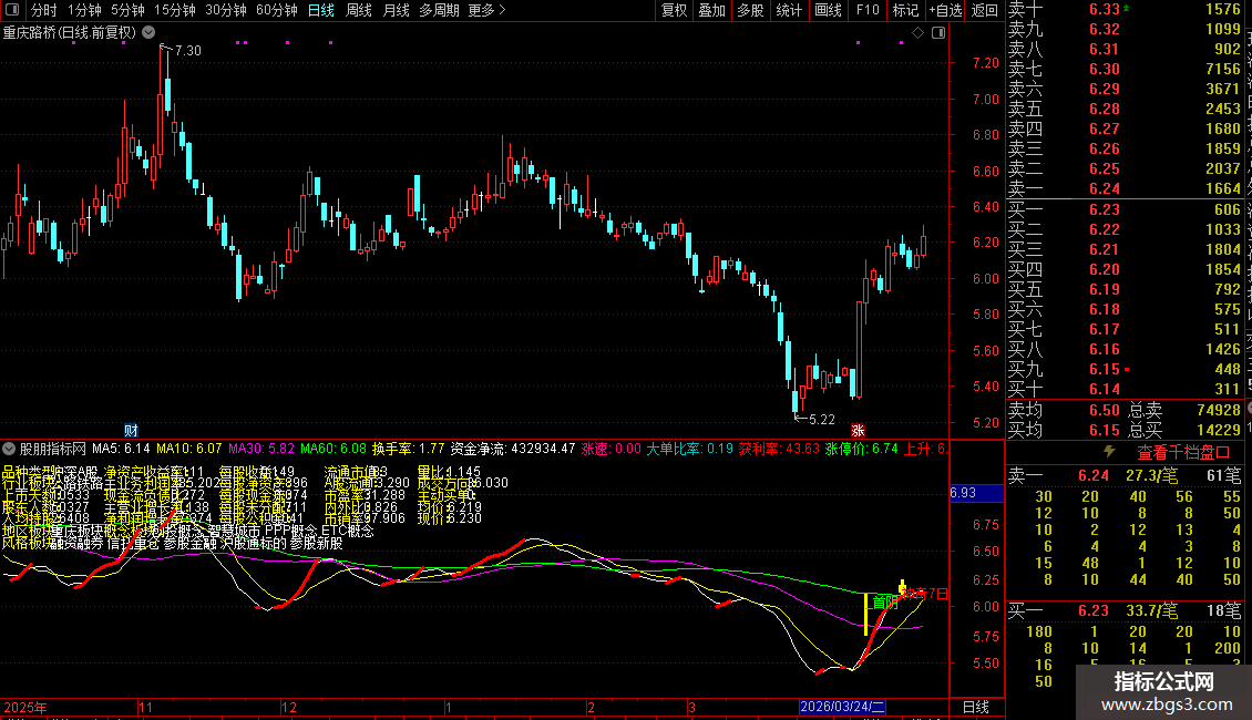 红轨道:=MA(MA(CLOSE,3),1),LINETHICK1,COLORYELLOW;