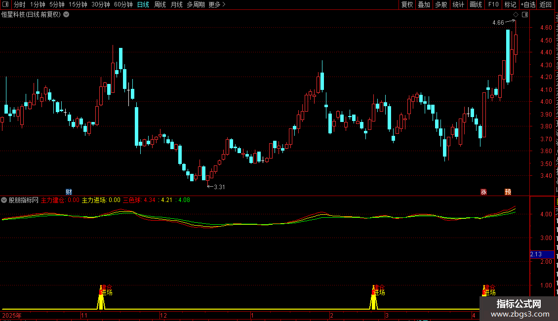 主图出现三色球,表示主力吸筹完毕准备进攻,主力建仓和主力进场能清晰地显示主力收集筹码的力度和时间。