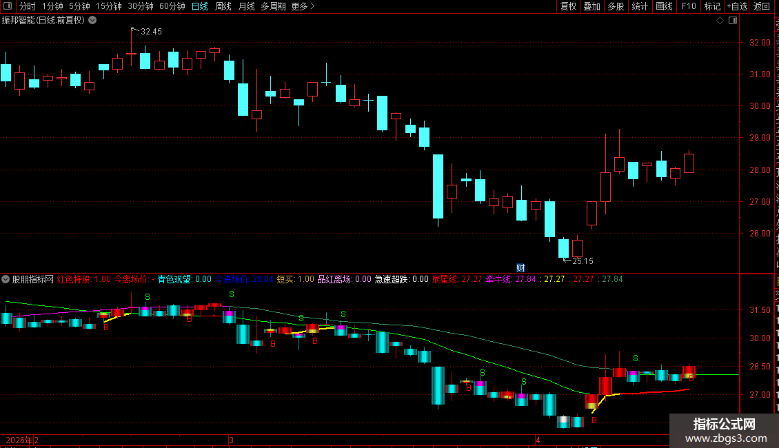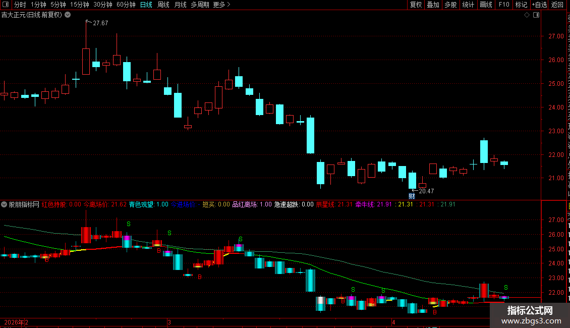 STICKLINE(ISLASTBAR AND (青色观望 OR REF(青色观望,1)=1),今进场价,今进场价,30,1),COLOR00FF00;