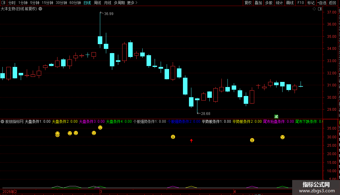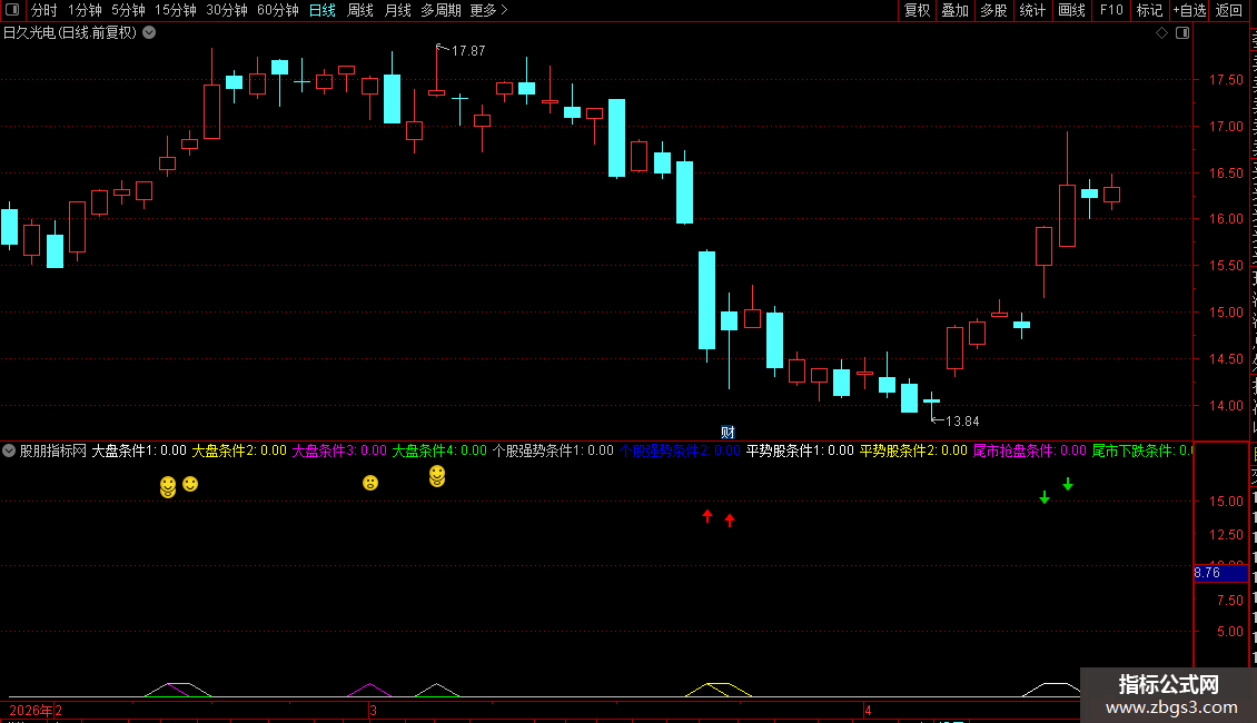 尾市抢盘条件:IF(V>REF(V,1)*1.5 AND CLOSE>OPEN AND BIAS5<=2,1,0);