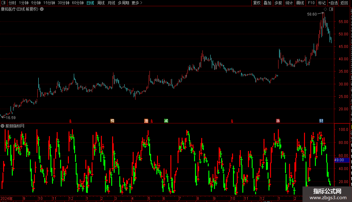 7、追涨杀跌:股价上升博弈K线破80近100时追进,只要博弈K线持续在80以上高位,根据K线组合形态上涨趋势未破就持股,待博弈K线向下破80 ,K线组合形态出现下跌信号时抛出,此法也须快进快出。