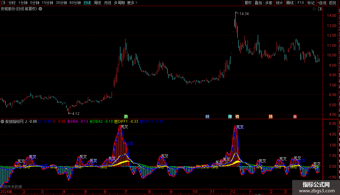 DRAWTEXT(FILTER(CROSS(D,K)AND J>0.2,5),D+0.09,'死叉');