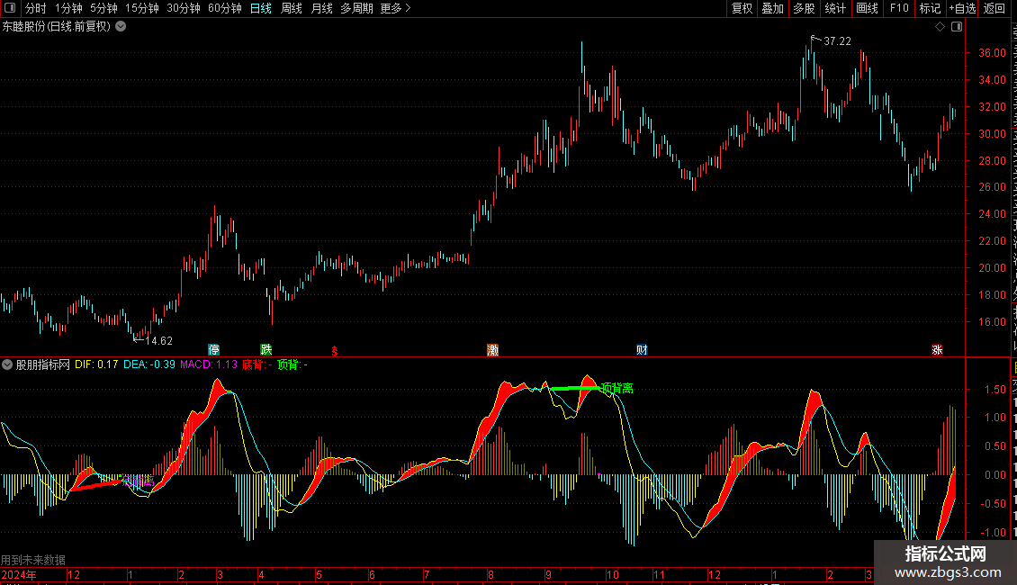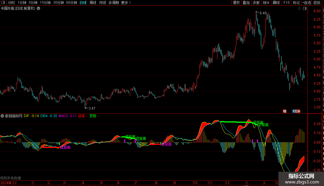 顶背:DRAWLINE(A2=0,DEA,顶背离,DEA,0),COLORGREEN,LINETHICK4;