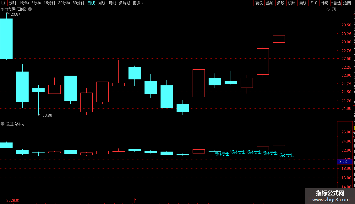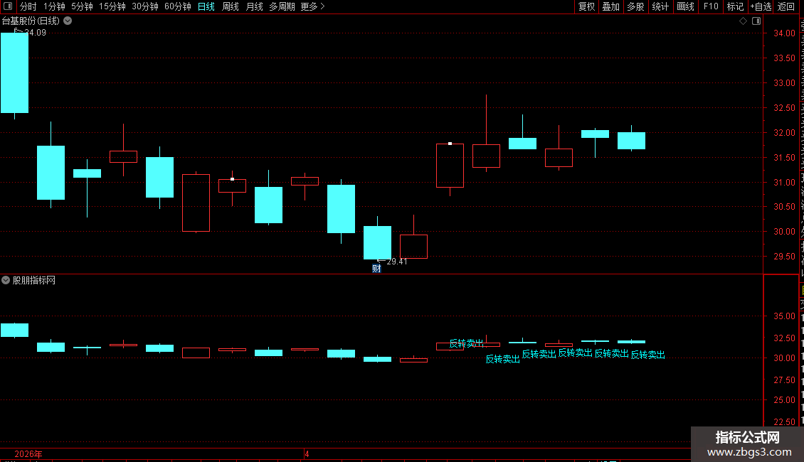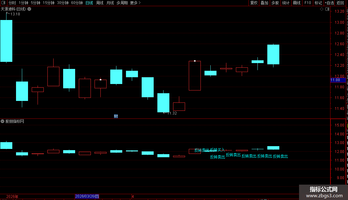 DRAWTEXT(C>=反转卖出价 AND C<观察卖出价,反转卖出价,'反转卖出'),COLORCYAN;