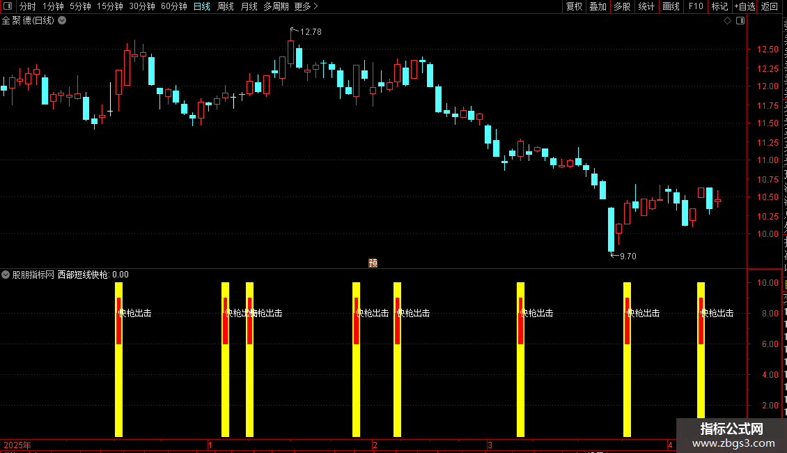 西部短线快枪:CROSS(C>REF(HHV(H,2),1),0.5) AND C>OPEN,NODRAW;