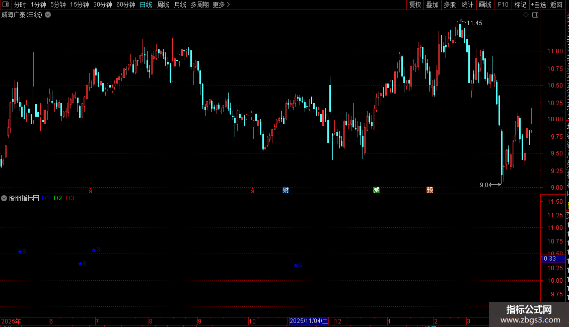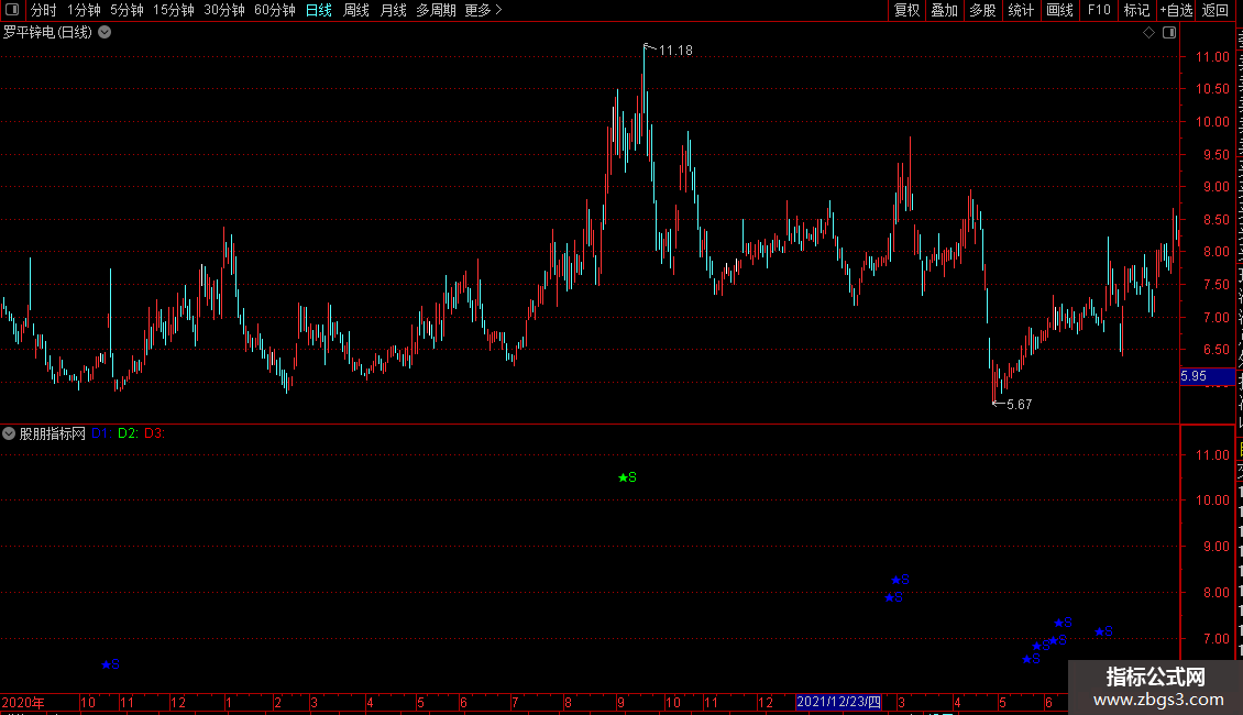 D1:DRAWTEXT(CLOSE<Z AND Z<REF(Z,1) AND REF(VAR4,1)>80 AND VAR4<REF(VAR4,1) AND REF(VAR4,1)>REF(VAR4,2),HIGH,'★S'),COLORBLUE;