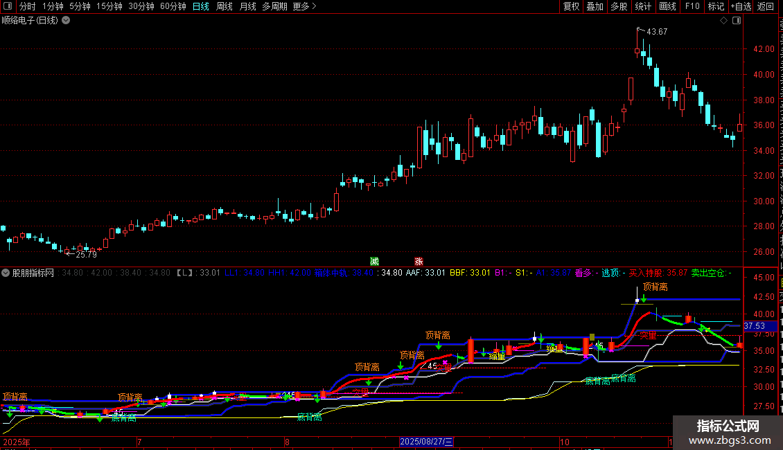 逃顶:IF(A1X<0 AND BARSLAST(CROSS(0,A1X))>0,REF((C+O)/2,BARSLAST(CROSS(0,A1X))),DRAWNULL),COLORCYAN,{LINETHICK2};