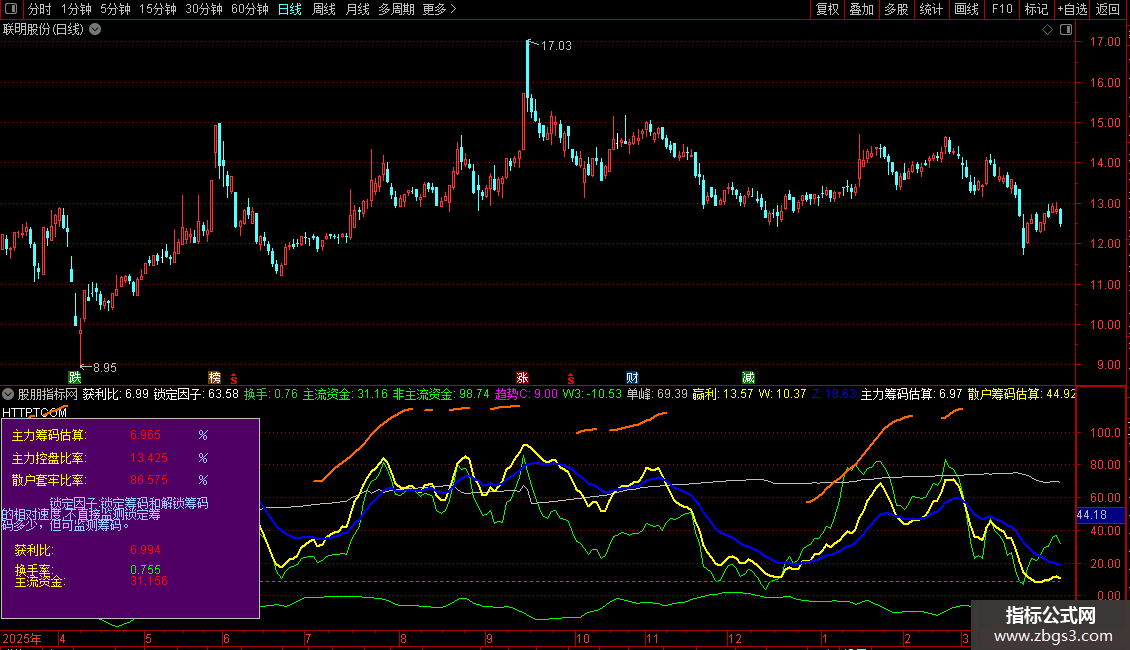 DRAWTEXT_FIX(CURRBARSCOUNT=1,0.01,0.10,0, '主力筹码估算:'),COLORYELLOW;