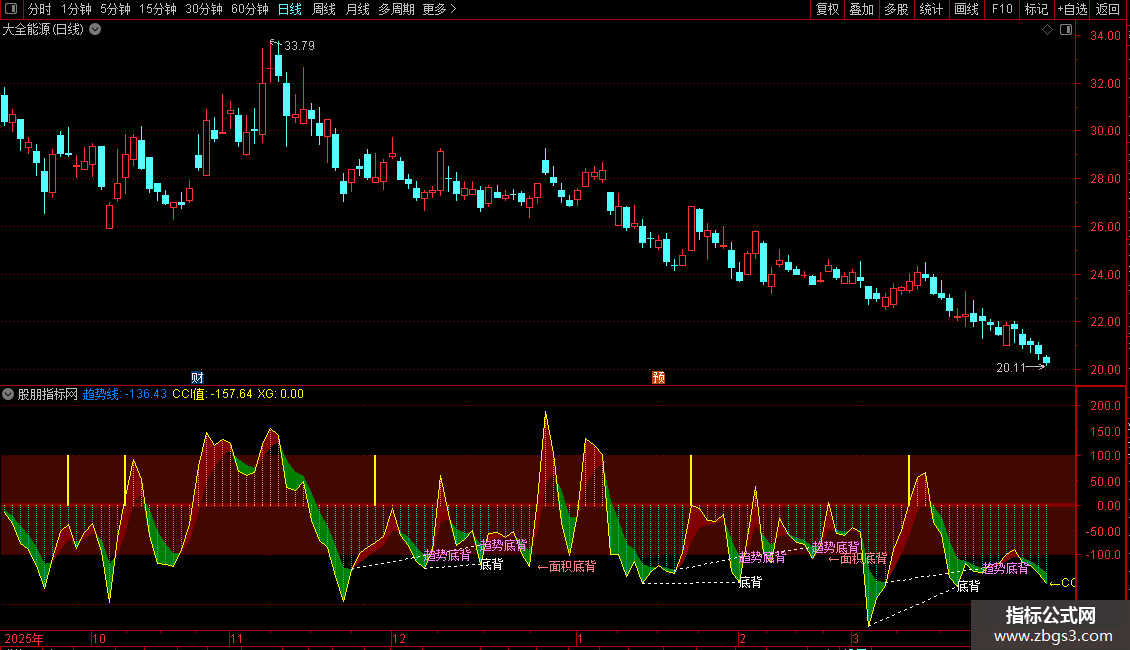 绿柱面积:=IF(CCI<0,SUM(CCI,BARSLAST(JC<0)),0);