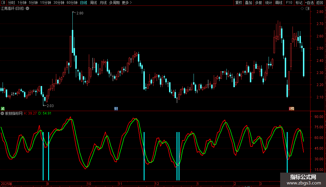 D: EMA(0.667*REF(K,1)+0.333*K,2),COLORGREEN,LINETHICK2;