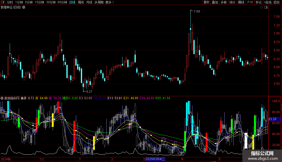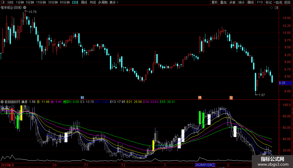 这个指标分为几个部分,一、表示换手率的,底下那根白色曲线。二、加权均线,就是那几根并列在一起的彩色线条。三、重点:博奕K线,由红 黄 白 绿 灰 阴阳K线组成。这个指标很直观,大红阳代表这个K线振幅较大,换手也较大。其它三色黄绿白代表力度依次减弱,灰色才是代表下降趋势,总的来说,这个指标更适用振荡行情,对于趋势行情使用上会不太准。这个指标也可以表示为获利筹码,但表达的范围不太大,当初是和筹码指标一起使用的,大家可以结合通达信自带的筹码指标一起判断。这个指标在判断顶部区域的的效果较好,底部判断较差(我个人一般不抄底)。