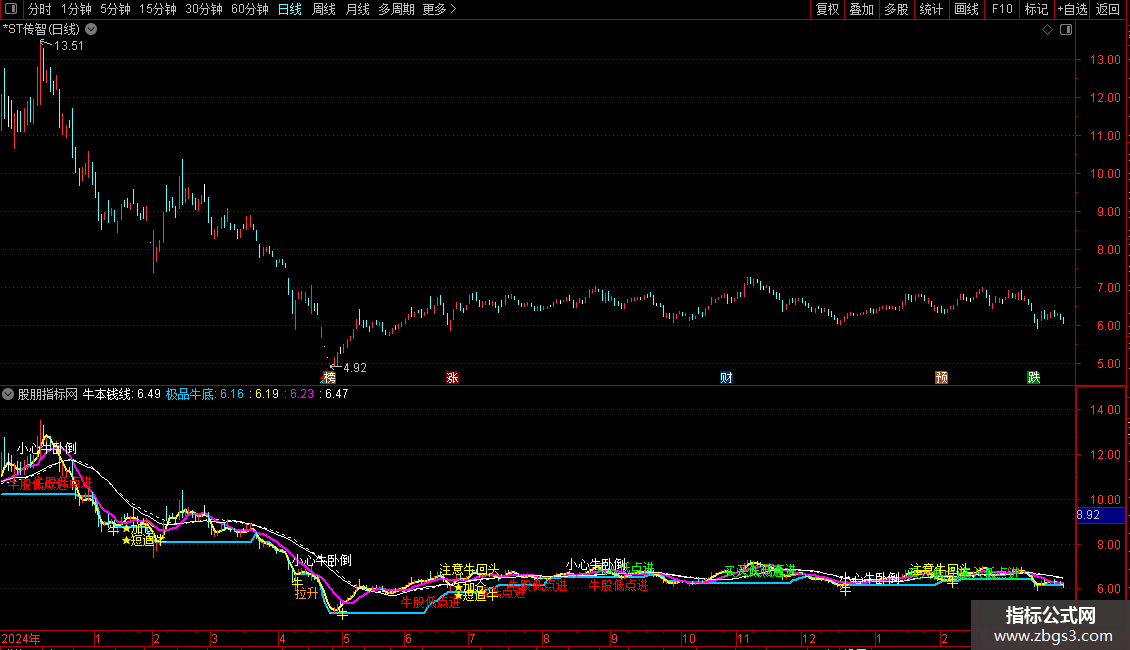 牛本钱线:EMA(X,13),COLORWHITE,DOTLINE;