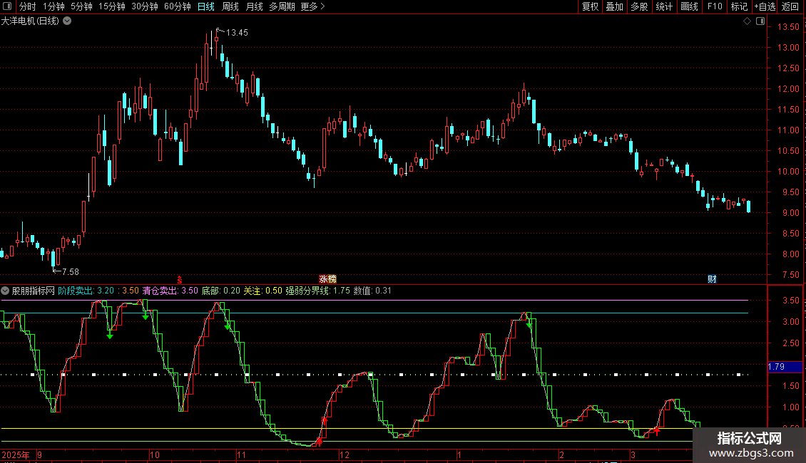 STICKLINE(动力线<=REF(动力线,1) ,动力线 ,REF(动力线,1),3 ,1),COLOR00FF00;