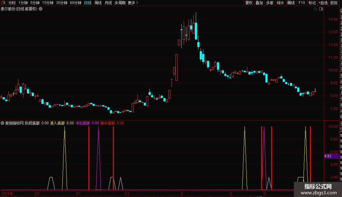 猎杀潜航:IF(CROSS(趋势,底部),10,0),STICK,COLORRED,LINETHICK3;