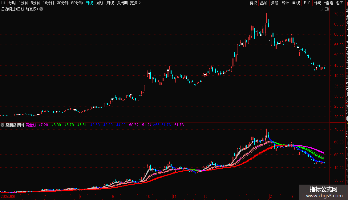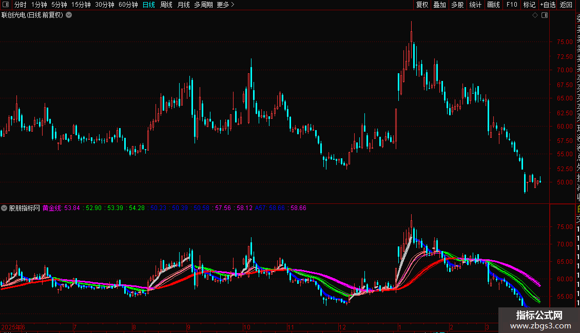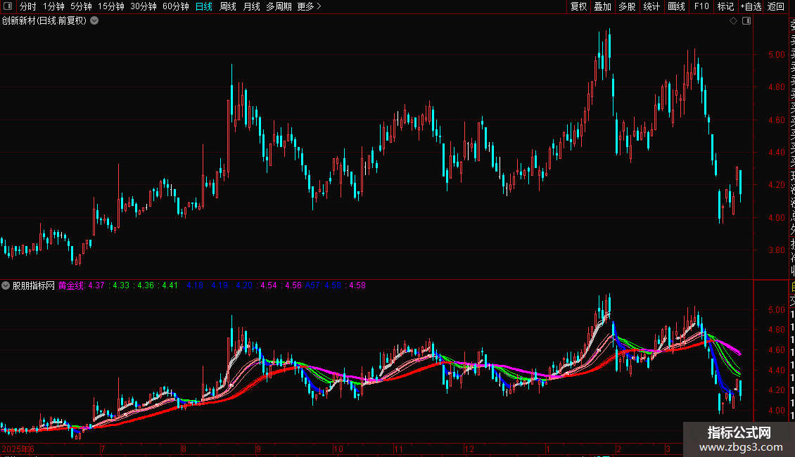 说明:K线在粉绿蓝之下代表空头