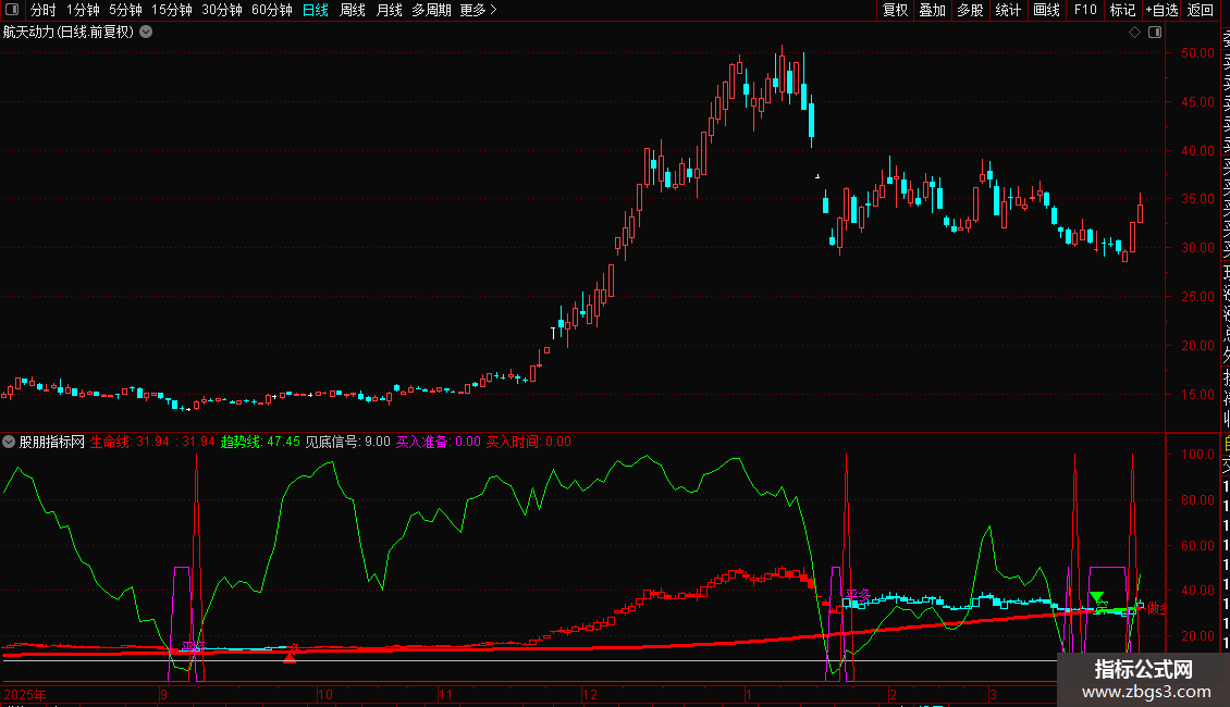 生命线:EMA(MA(C,66),60),LINETHICK2,COLORRED;