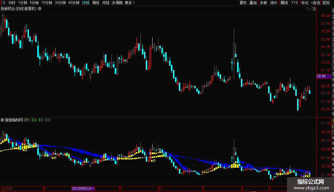 D1:DRAWTEXT(CLOSE>Z AND REF(VAR4,1)<30 AND VAR4>REF(VAR4,1) AND REF(VAR4,1)<REF(VAR4,2) ,LOW ,'★B'),COLORYELLOW;