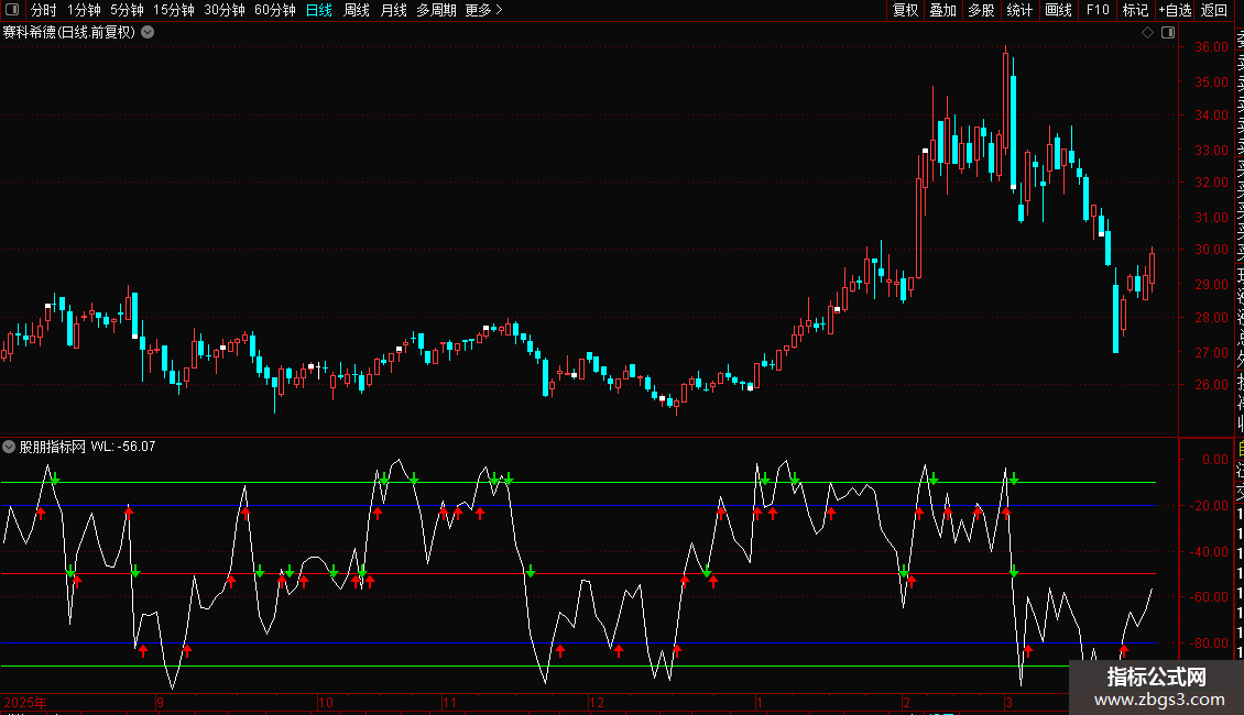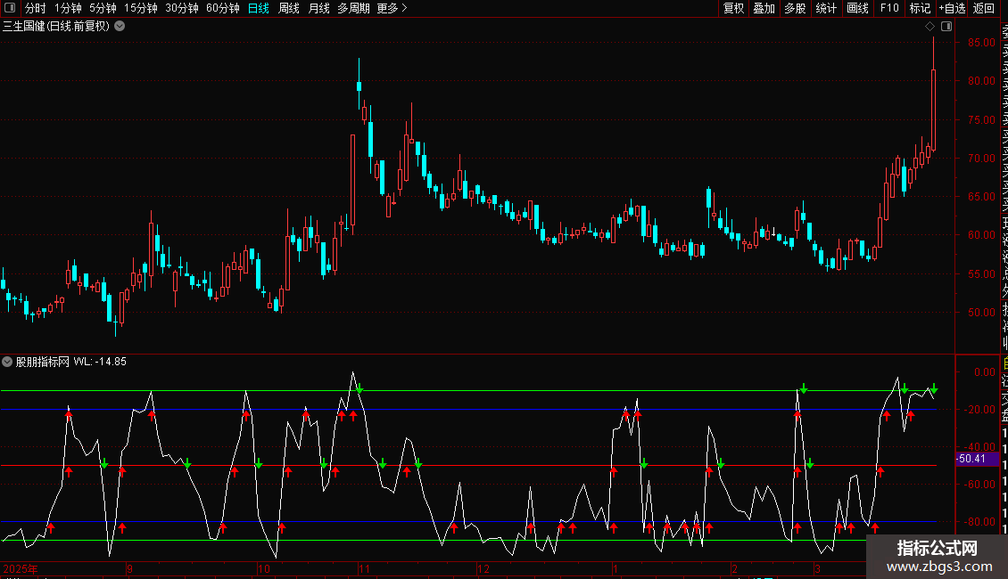 用法:WL上穿-80为波段买点,WL下穿-10为波段卖点,WL在-80和-50区间运行为弱势区域,WL在-50和-20区间运行为强势区域。